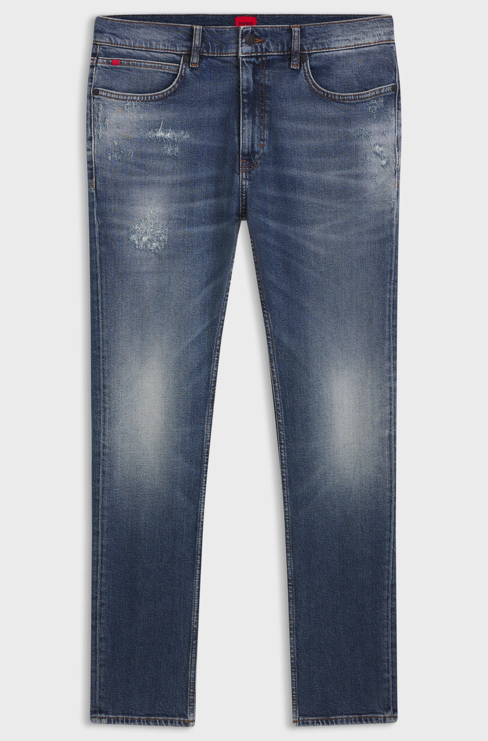 Avec des effets usés sur un denim stretch bleu foncé, ce jean HUGO Homme est très facile à styliser. Coupe droite ajustée.